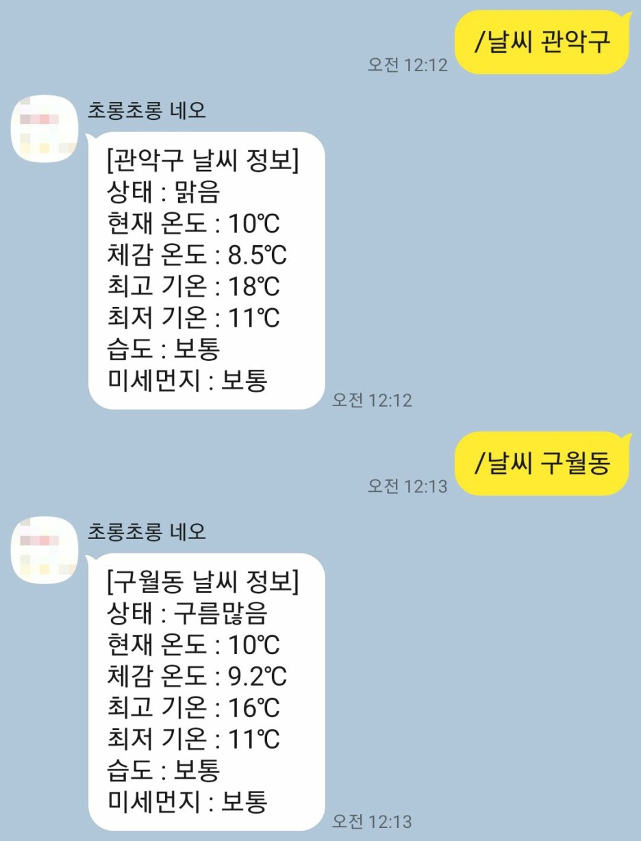 위에 있는 날씨봇도 오류가 있는데, 네이버 검색 결과를 가져오다보니 검색 결과가 다른 형태인 경우(외국날씨, 광고가 먼저 나오는 등) 정보를 불러오는데 문제가 발생한다.
